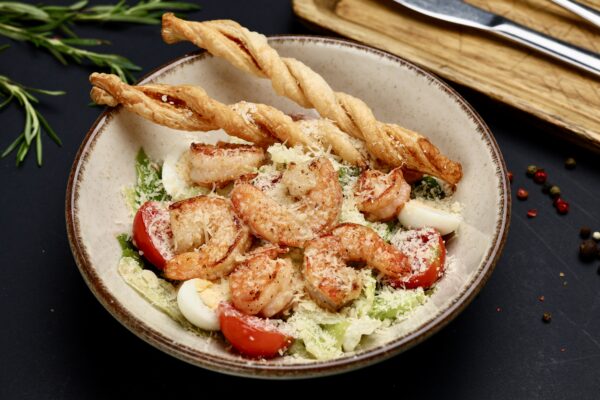 The branded salad "Na Mangal" with softy tenderloin roast cooked medium-degree, served with a mix of fresh salad, grilled mushrooms, onion, cherry tomatoes, and cucumber. A salad seasoned with sour and sweet sauce carpaccio, decorated with sesame and balsamic sauce.