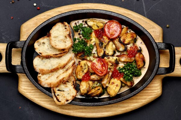 Flavorful pork ribs, caramelized in BBQ sauce. At first, we cook the ribs on the brazier to the crust, that’s why they have unique smoked aromatic. Then we add sesames, a sprig of rosemary, and the best hot appetizer for beer is done.